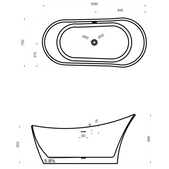 Ванна из литьевого мрамора Abber Stein AS9618 169x75 см, отдельностоящая, белый матовый