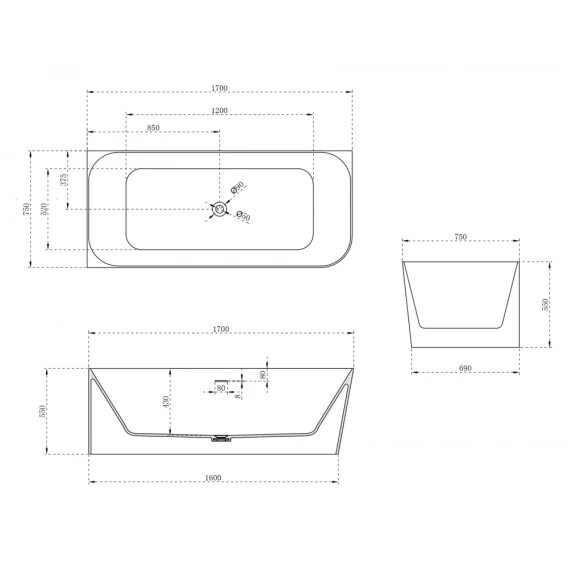 Ванна из литьевого мрамора Abber Stein AS9621-1.7 170x75 см L, белый матовый