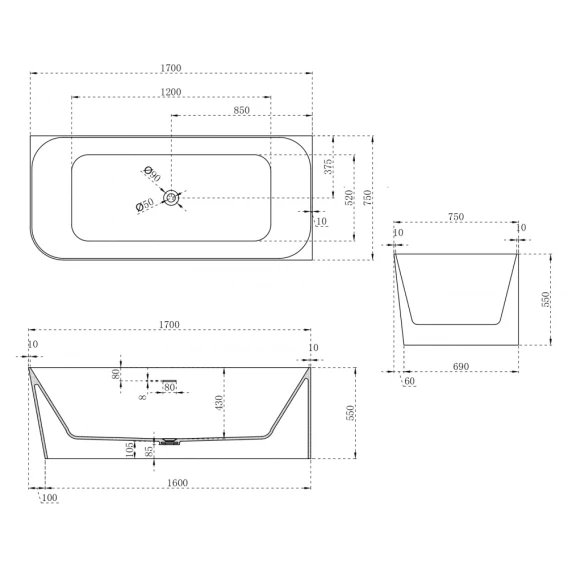Ванна из литьевого мрамора Abber Stein AS9621-1.7 170x75 см R, белый матовый