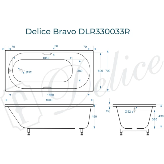 Ванна из литьевого мрамора Delice Bravo DLR330033RB-G 160x70 см, с ручками, белый глянец