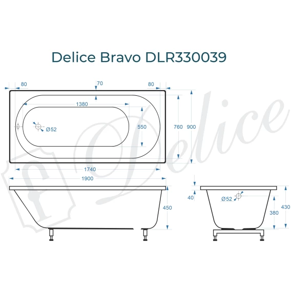 Для установки используются фирменные ножки Delice, которые имеют надежное и прочное крепление, обеспечивают высокую устойчивость ванны и регулируются по высоте. Высота на ножках варьируется от 59.5 до 63 см. С помощью регулировки можно нивелировать геометрические отклонения пола, стен и углов в ванной комнате. За счет высокой плотности материала, при установке не требуется шумоизоляция, а также заземление, так как литьевой мрамор не проводит электрический ток. При необходимости изменения габаритов под ванную комнату, борты ванны можно уменьшить механической обработкой.