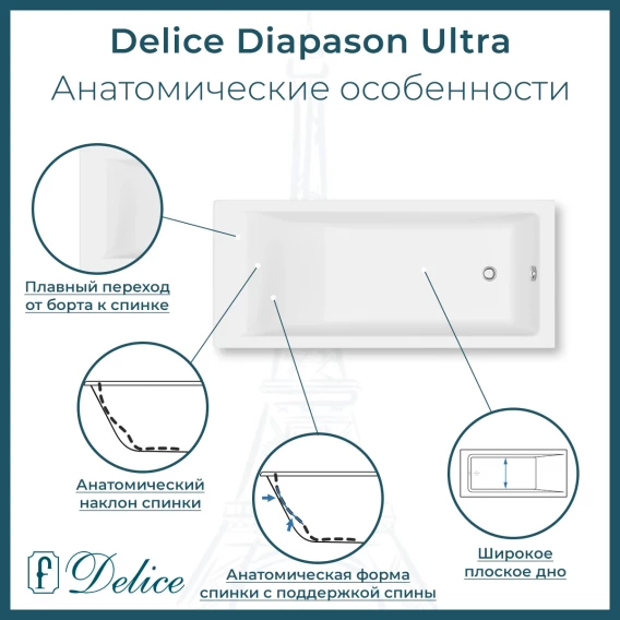 Модель Diapason Ultra - комфортная и стильная ванна, которая отлично дополнит интерьер ванной комнаты. Безупречный белый цвет подчеркивает геометрию и стильный дизайн. Плавный переход бортика в спинку, широкая чаша и удлиненное дно гарантируют удобное положение тела, а ровное плоское дно позволяет легко передвигаться в ванне, принимая душ. Ванна сочетает в себе все актуальные тенденции в сантехнике, к ней легко подобрать подходящие аксессуары, мебель и другие элементы интерьера. Для завершения интеграции в дизайн к ней можно подобрать слив-перелив в тон смесителей. Финишное глянцевое покрытие обеспечивает премиальный внешний вид и легкий уход.