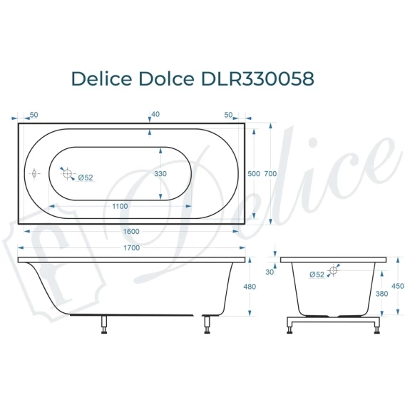 Размерный ряд ванны из литьевого мрамора Delice Dolce: 170х70, 170х75 и 170х80 см.
