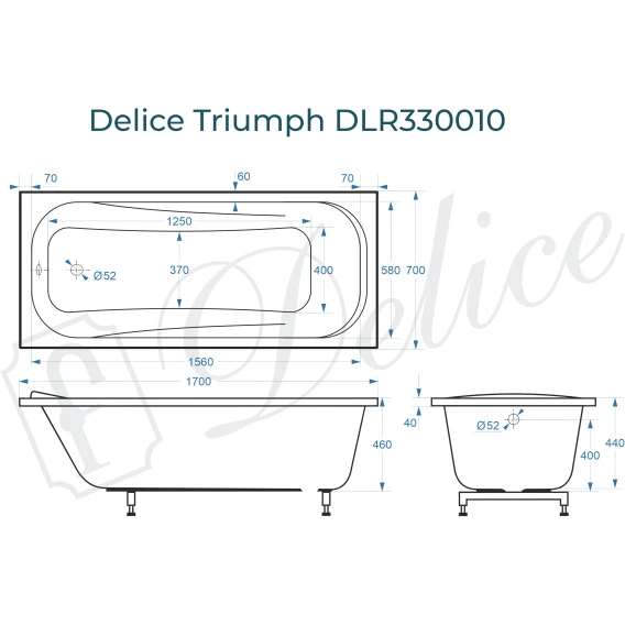 Размерный ряд ванны из литьевого мрамора Delice Bravo: 170х70, 170х75 и 180х80 см.