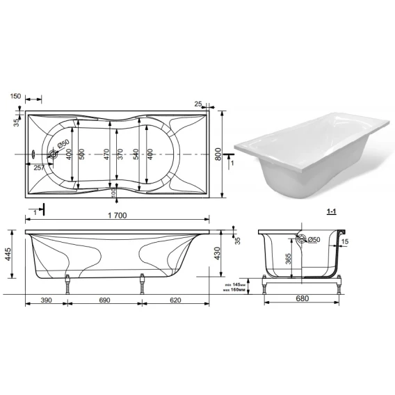 Акриловая ванна 170x80 см L Abber AB9438-1.7 L