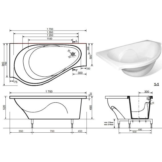 Акриловая ванна 170x90 см левая Vayer Boomerang GL000009592