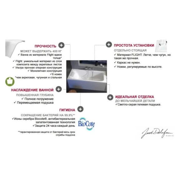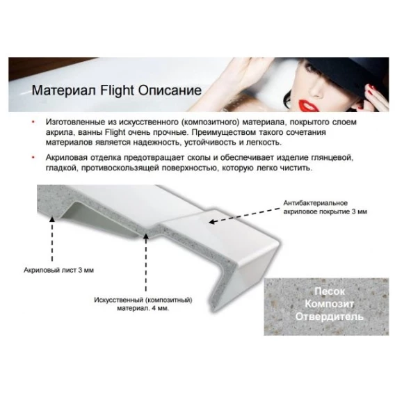 • Flight – это уникальный материал, запатентованный Jacob Delafon, состоящий из слоя композита между двумя слоями листа чистого литьевого акрила