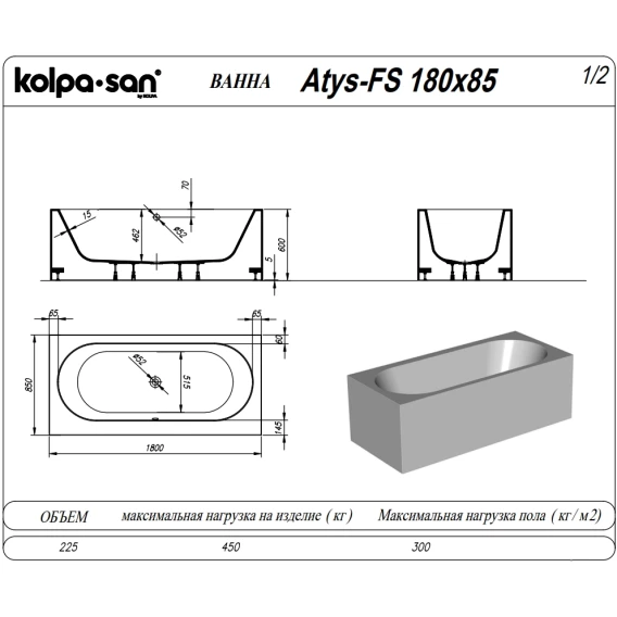 Ванна из литьевого мрамора Kolpa-San Atys FS 622830 180x85 см, отдельностоящая, белый матовый