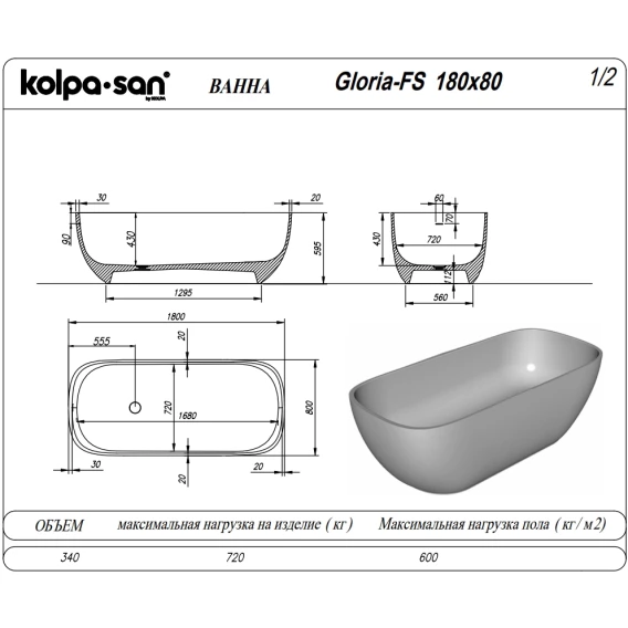 Ванна из литьевого мрамора Kolpa-San Gloria FS 622640 180x80 см, отдельностоящая, белый матовый