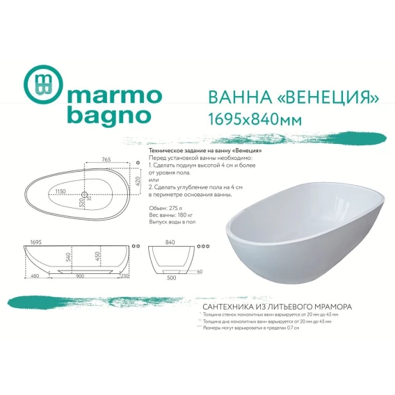 Ванна из литьевого мрамора Marmo Bagno Венеция MB-VN170-85 169,5x84 см, отдельностоящая, белый