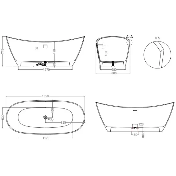 Ванна из литьевого мрамора Salini S-Stone Noemi 101811SMF 185x80 см, отдельностоящая, покраска по RAL матовый полностью