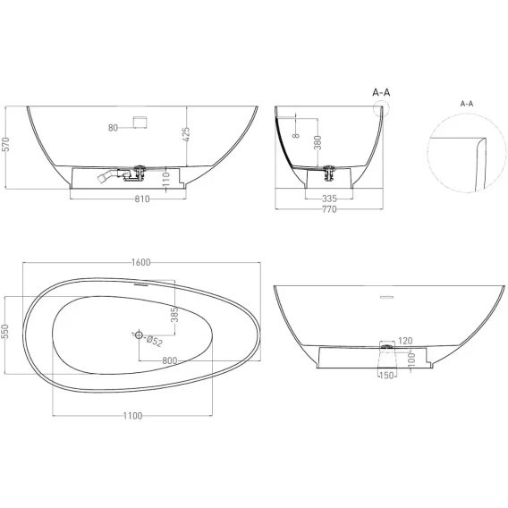 Ванна из литьевого мрамора Salini S-Stone Paola Classic 101511SMF 160x77 см, отдельностоящая, покраска по RAL матовый полностью