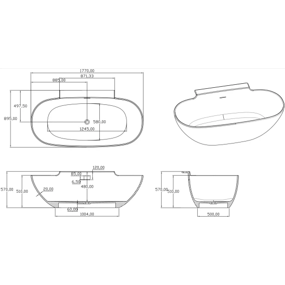 Ванна из литьевого мрамора Timo Lumi Solid Surface LUMI1770 177x89,5 см, отдельностоящая, белый матовый