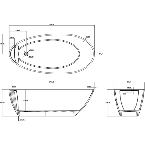 Ванна из литьевого мрамора Timo Mari Solid Surface MARI1700 170x80 см, отдельностоящая, белый матовый