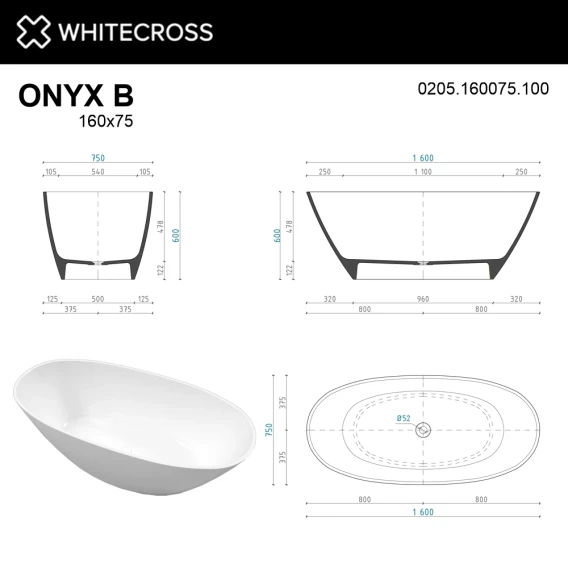 Ванна из литьевого мрамора Whitecross Onyx B 0205.160075.100 160x75 см, отдельностоящая, белый глянец