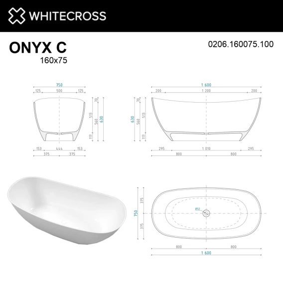Ванна из литьевого мрамора Whitecross Onyx C 0206.160075.100 160x75 см, отдельностоящая, белый глянец