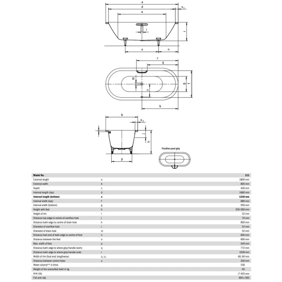 Ванна стальная Kaldewei Classic Duo Oval 111 291230003001 180x80 см, с антискользящим и водоотталкивающим покрытием, альпийский белый