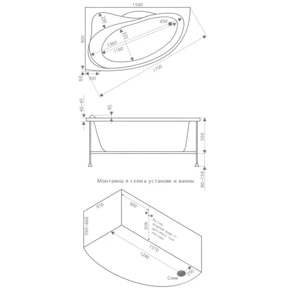 Акриловая ванна 150x90 см R Bas Вектра B00008