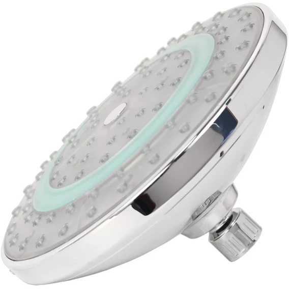 Материал - пластик 80 форсунок с системой защиты от известковых отложений Хромоникелевое покрытие Размер: диаметр 200 мм Толщина: 80 мм Резьба G1/2" Гарантия 1 год Подсветка: не требует дополнительных источников питания, вся система работает от давления и температуры воды. Срок работы: 6000 часов Смена цвета: до 31*С - желтый от 32*С до 43*С - зеленый от 44*С до 50*С - красный от 51*С - пульсирующий красный.