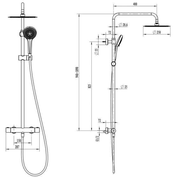 Металлическая розетка, Эксцентрики, Душевой шланг, Душевая лейка, Держатель для душевой лейки, Верхний душ, Кронштейн, Штанга душевая, Термостат