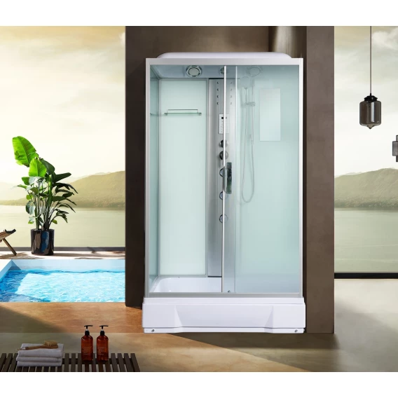 Душевой шланг, Душевая лейка, Держатель для душевой лейки, Полочка, Подсветка, Верхний душ, Динамик, Подсветка “Лунный свет”, Поддон, Сиденье, Радио, Смеситель, Сифон, Штанга душевая, Зеркало