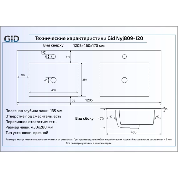 Раковина 120,5x46 см GID Simple N NYJ809-120