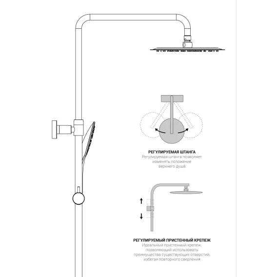 Аэратор, Металлическая розетка, Эксцентрики, Душевой шланг, Душевая лейка, Держатель для душевой лейки, Верхний душ, Смеситель, Кронштейн, Штанга душевая