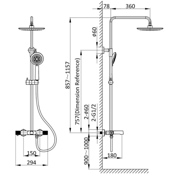 Аэратор, Металлическая розетка, Эксцентрики, Душевой шланг, Душевая лейка, Держатель для душевой лейки, Верхний душ, Кронштейн, Штанга душевая, Термостат