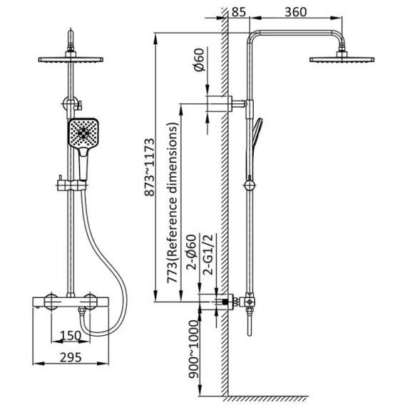 Металлическая розетка, Эксцентрики, Душевой шланг, Душевая лейка, Держатель для душевой лейки, Верхний душ, Кронштейн, Штанга душевая, Термостат