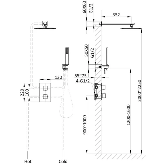 Душевой шланг, Душевая лейка, Подключение для душевого шланга с держателем, Верхний душ, Скрытая монтажная часть, Кронштейн, Термостат