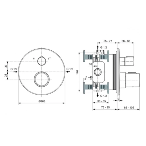 • Термостатический картридж IS, 2-х ходовые клапаны на керамических дисках 90˚