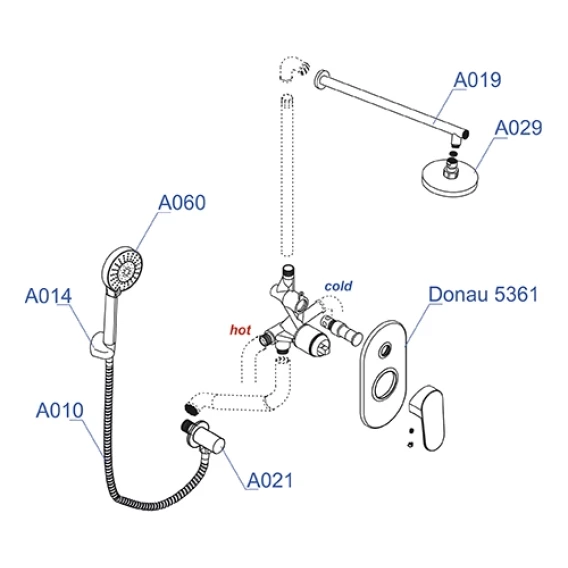 Душевой шланг, Душевая лейка, Держатель для душевой лейки, Подключение для душевого шланга, Верхний душ, Скрытая монтажная часть, Смеситель, Кронштейн