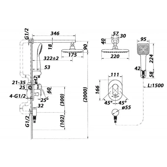 Душевой шланг, Душевая лейка, Держатель для душевой лейки, Подключение для душевого шланга, Верхний душ, Смеситель, Кронштейн
