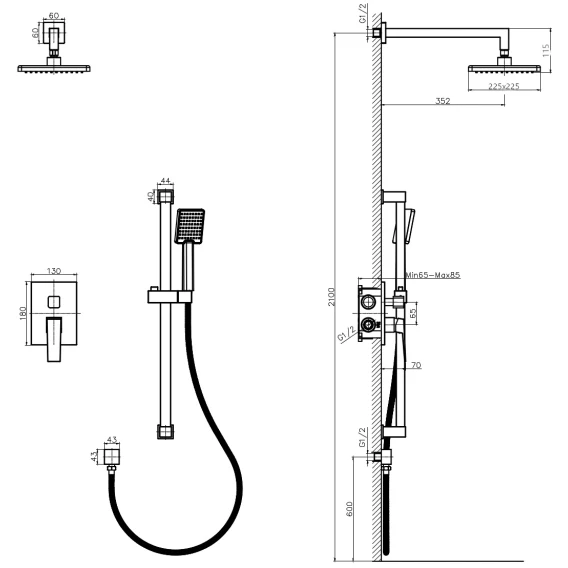 Душевой шланг, Душевая лейка, Держатель для душевой лейки, Подключение для душевого шланга, Верхний душ, Скрытая монтажная часть, Смеситель, Кронштейн