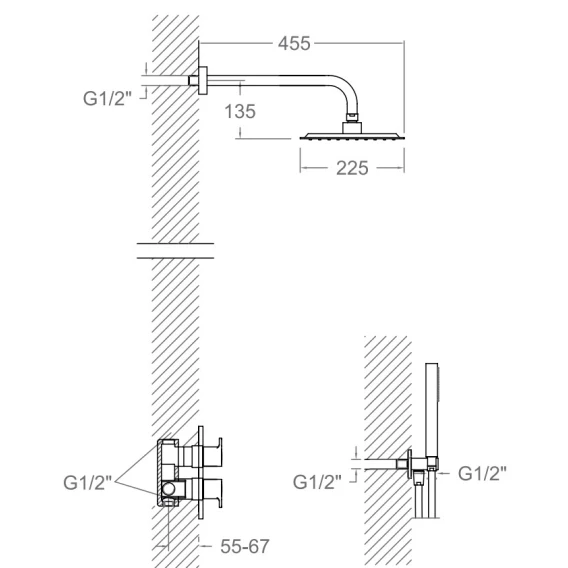 Душевой шланг, Душевая лейка, Держатель для душевой лейки, Подключение для душевого шланга с держателем, Верхний душ, Скрытая монтажная часть, Кронштейн, Термостат