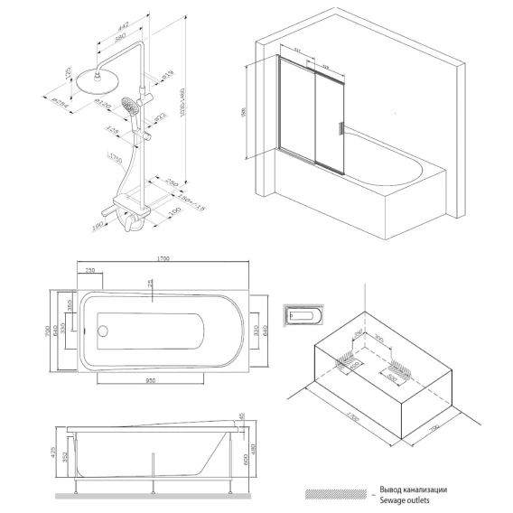 Металлический каркас, Ножки, Шторка для ванны, Душевая система