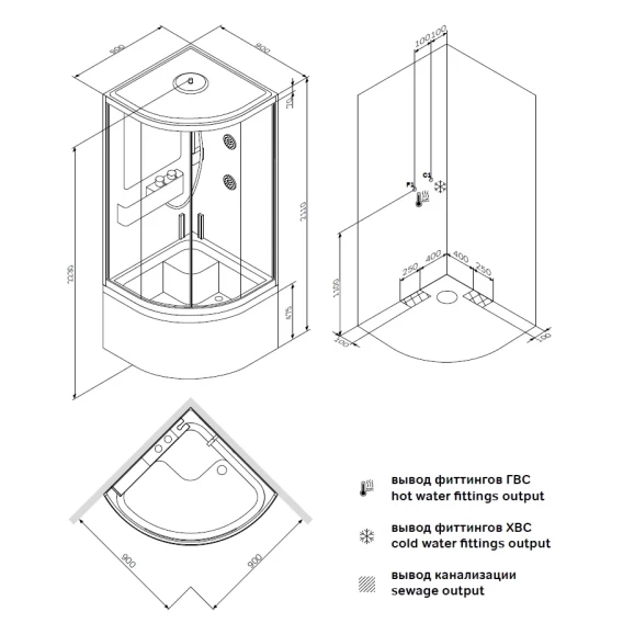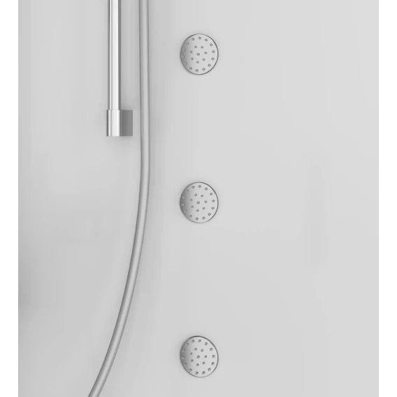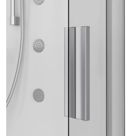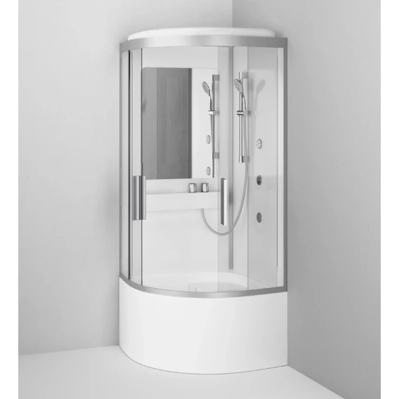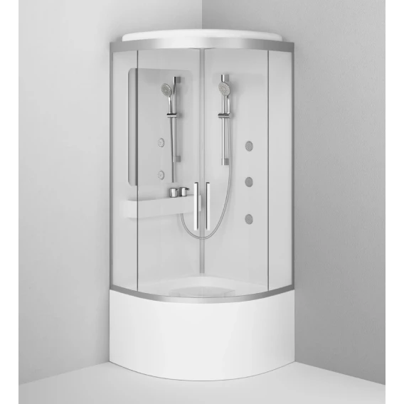 Душевой шланг, Душевая лейка, Держатель для душевой лейки, Полочка, Верхний душ, Металлический каркас, Поддон, Сиденье, Смеситель, Сифон, Штанга душевая, Ножки, Зеркало