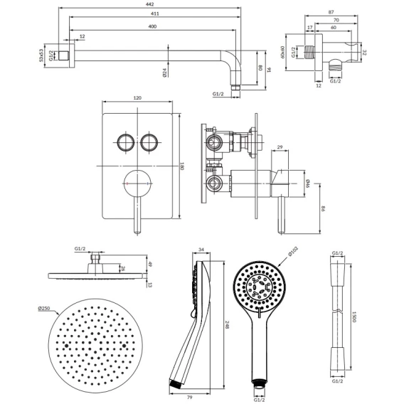 Душевой шланг, Душевая лейка, Подключение для душевого шланга с держателем, Верхний душ, Скрытая монтажная часть, Смеситель, Кронштейн