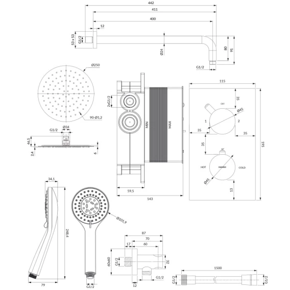 Душевой шланг, Душевая лейка, Подключение для душевого шланга с держателем, Верхний душ, Смеситель, Кронштейн, Термостат