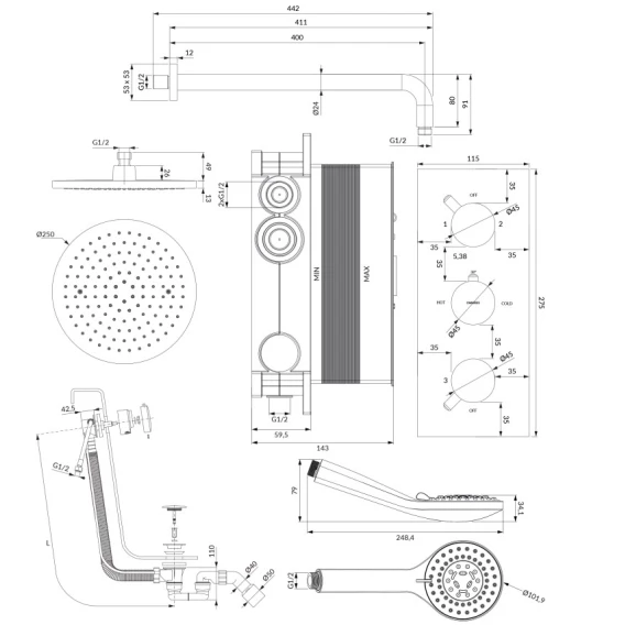 Душевой шланг, Душевая лейка, Подключение для душевого шланга с держателем, Верхний душ, Скрытая монтажная часть, Слив-перелив, Кронштейн, Термостат