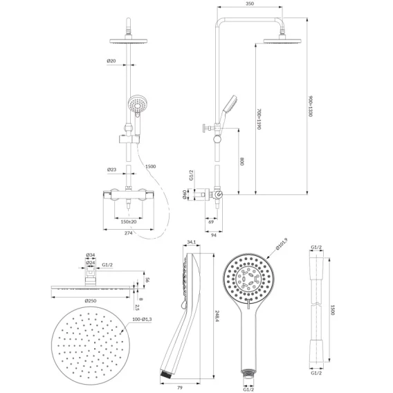 Металлическая розетка, Эксцентрики, Душевой шланг, Душевая лейка, Держатель для душевой лейки, Верхний душ, Кронштейн, Штанга душевая, Термостат