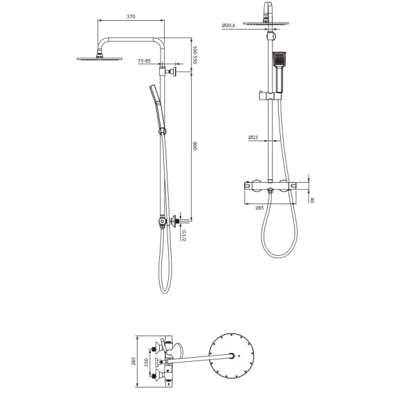 Металлическая розетка, Эксцентрики, Душевой шланг, Душевая лейка, Держатель для душевой лейки, Верхний душ, Кронштейн, Штанга душевая, Термостат