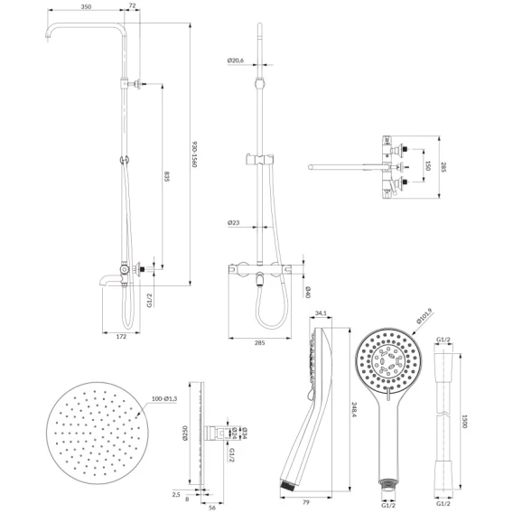Аэратор, Металлическая розетка, Эксцентрики, Душевой шланг, Душевая лейка, Держатель для душевой лейки, Верхний душ, Кронштейн, Штанга душевая, Термостат