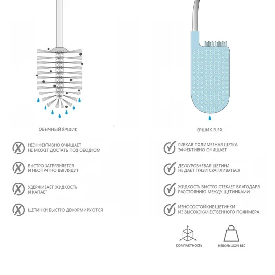 Инновационный аксессуар, который решает все проблемы поддержания чистоты и порядка санузла. Он был создан с учётом всех минусов обычных ёршиков. Теперь так просто поддерживать безупречную чистоту без лишних усилий!Гибкая полимерная щетка эффективно очищает все труднодоступные места и не впитывает воду. Высокотехнологичный материал ёршика не притягивает грязь и его легко мыть. Двухуровневая щетина с большим расстоянием между щетинками не дает грязи скапливаться.После уборки ёршик не надо стряхивать, пытаясь очистить и высушить, благодаря уникальному дизайну Flex™, вода быстро стекает со щетки и не оставляет лишних капель.Удобная и компактная подставка оснащена специальным многофункциональным отсеком, который можно использовать для хранения аэрозолей и моющих средств. Таким образом, они будут спрятаны от постороннего глаза, но останутся под рукой. При уборке с отбеливающими средствами стоит избегать его попадания на ручку из нержавеющей стали.Ванная — одна из наиболее сложных для уборки комнат. Здесь вопрос экономии места особенно актуален. Для создания новых аксессуаров дизайнеры Joseph Joseph руководствовались принципами рационального использования пространства, эргономичностью и удобством сортировки.