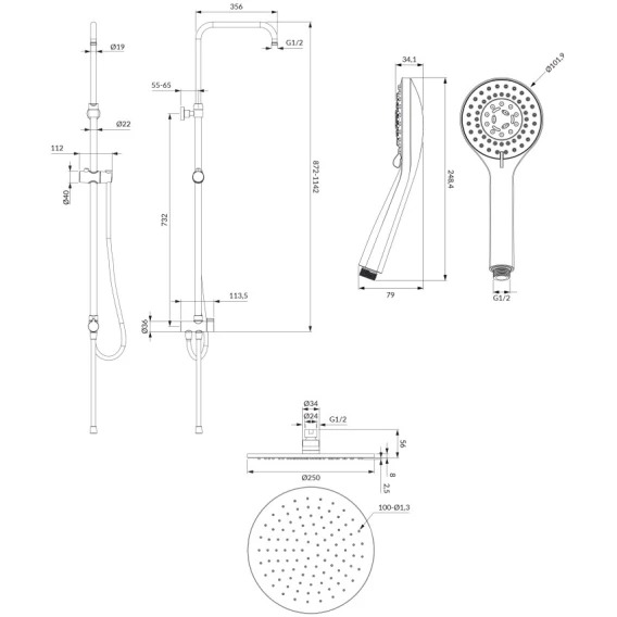 Душевой шланг, Душевая лейка, Держатель для душевой лейки, Верхний душ, Кронштейн, Штанга душевая