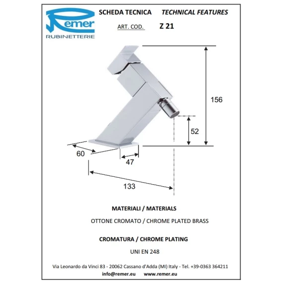 Смеситель для раковины без донного клапана Remer Absolute AU11