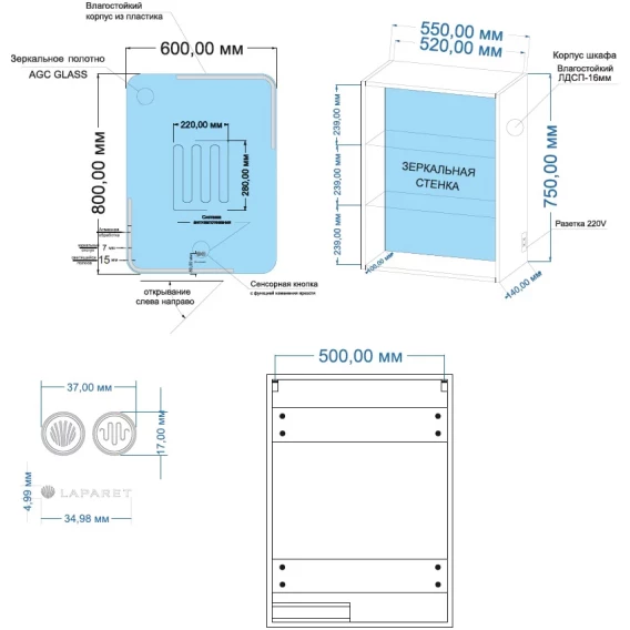 Механизм доводчика, Полочка, LED подсветка, Розетка, Сенсорный выключатель, Функция анти-пар