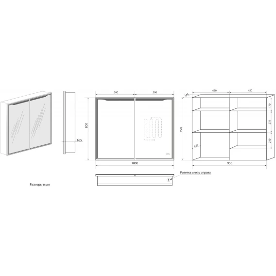 • Оснащение: зеркало-шкаф, провод с вилкой 1м, розетка, 4 полки, навес, коробка, инструкция.