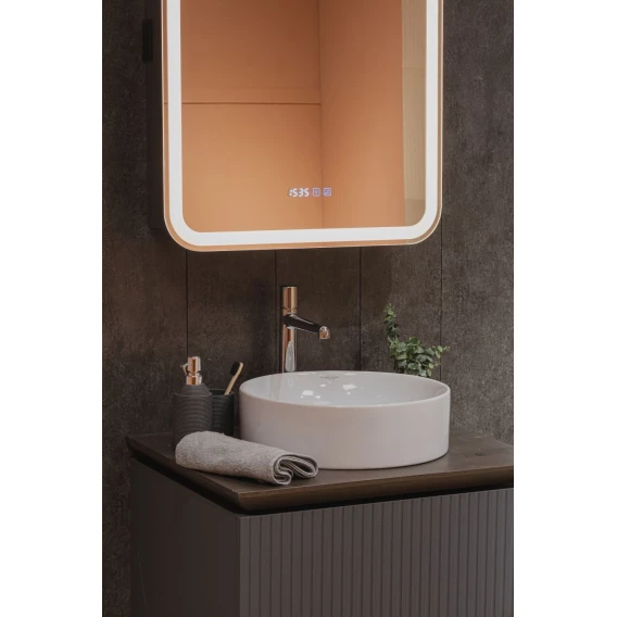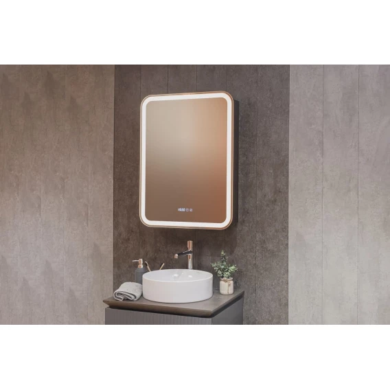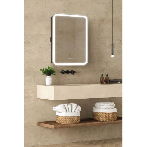 • Зеркало-шкаф, оснащенное светодиодной LED подсветкой с диммером, часами и функцией антизапотевания.