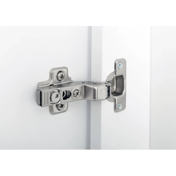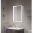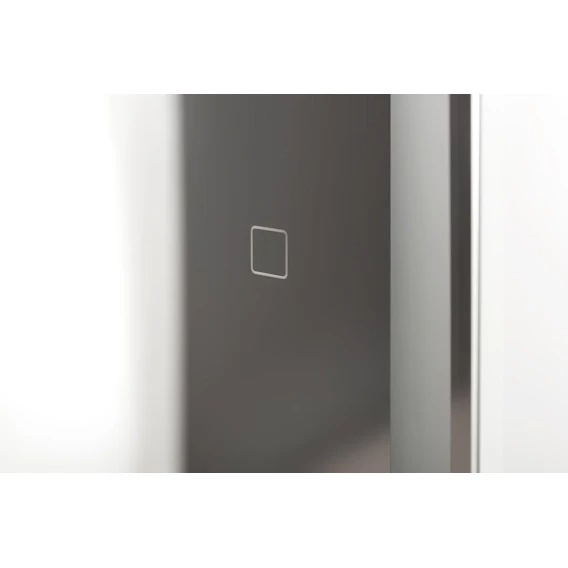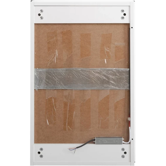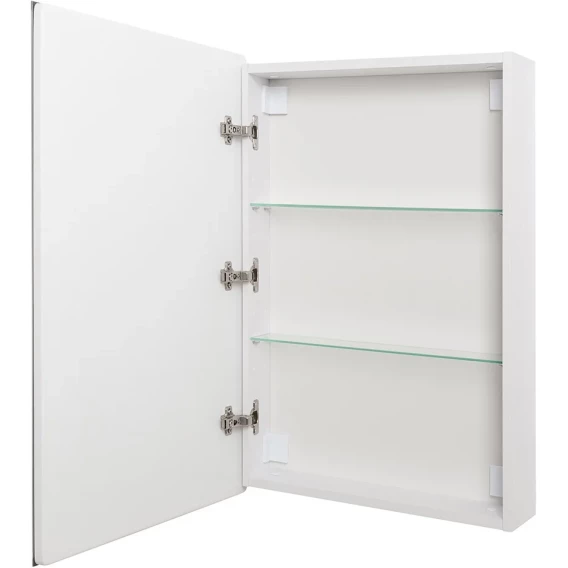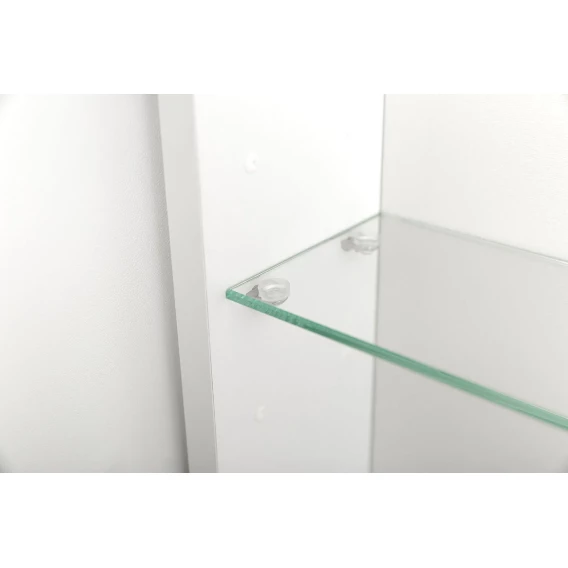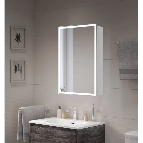 Зеркальный шкаф с одной распашной дверью, реверсный (правый или левый), со встроенной подсветкой и сенсорным выключателем. Петли с доводчиком. Лента закрыта коробом из светорассеивающего пластика, питание через петлю. Две стеклянные полки с возможностью регулировки высоты, полкодержатели с силиконовыми накладками. Корпус из ЛДСП белого цвета, лента SMD 3528 IP44, 12V, 6000 К, холодный свет.